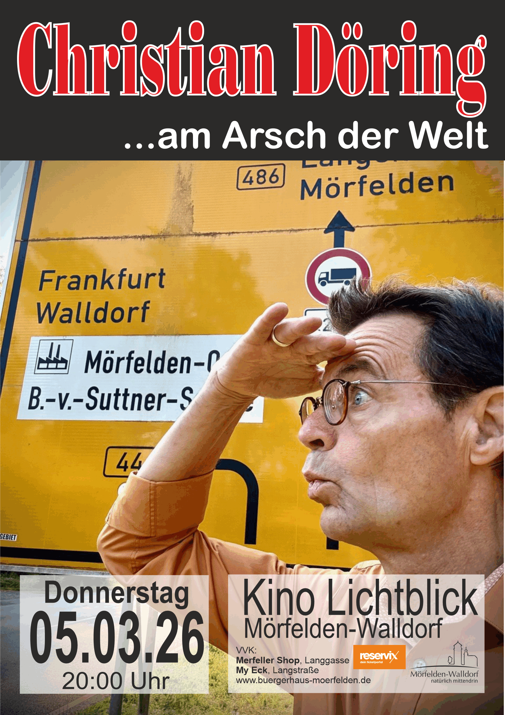 Wer in unbekannte, entlegene Orte dieser Welt reisen möchte, hat unzählige Möglichkeiten: Itseqqortoormiit? Gorak-Shep? Klein-Rohrheim? Aber wo liegt er wirklich: der Arsch der Welt? In Grönland? Im Himalaya? An der B44? Oder doch im eigenen Gehirn? Das fragt sich Christian Döring in seinem mittlerweile 5. Solo-Programm. Auch im Lichtblick sorgte er schon für ausverkaufte Abende, als Solist ebenso wie mit Pianist Christoph Oeser bei ihrem gemeinsamen Programm „On the Ried-Road“. Und jetzt: „Wo bitte geht’s zum Arsch der Welt?“ – eine Nah- und Fern-Reise zu Traum- und Albtraumzielen, zu Peinlichkeits-Gipfeln und Intelligenz-Wüsten.